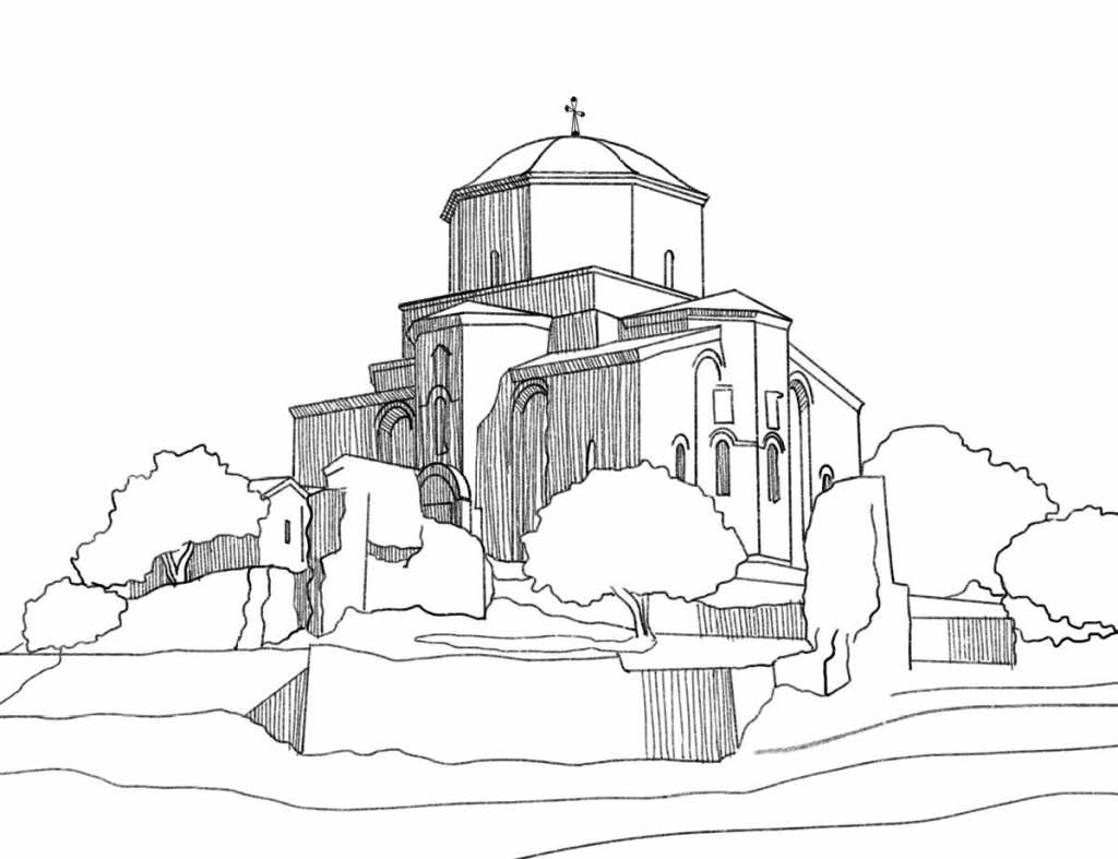 built 586–630s on a hill above Mtskheta at the confluence of the Kura and Aragvi; a distinct South Caucasus tetraconch type; UNESCO since 1994