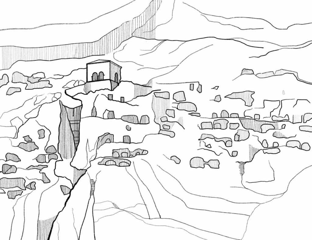 12th-century rock-cut monastery above the Mtkvari; 13 tiers of galleries and cells; Church of the Dormition with frescoes from the 1180s