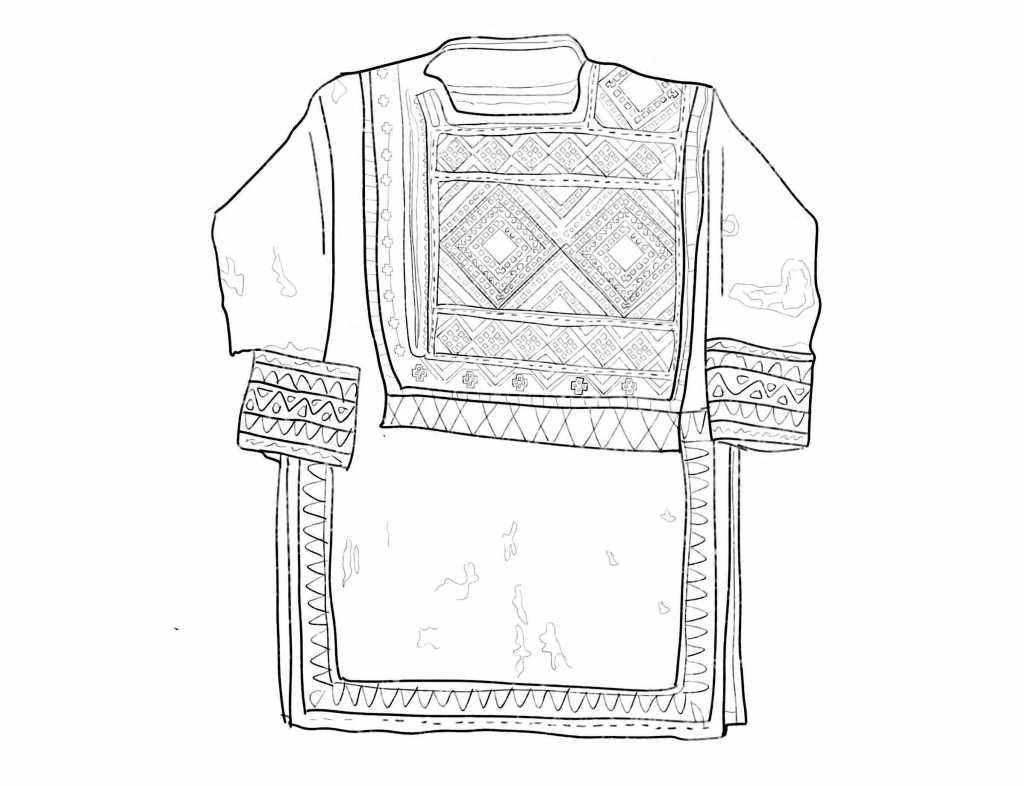highland costume of Khevsureti; richly embroidered woolen tunic with dense cross-shaped and geometric motifs