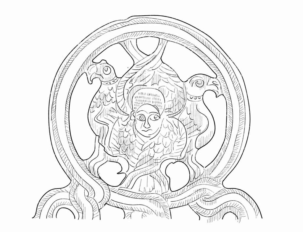 fragment of a 10th-century silver liturgical fan; chased decoration with a cherub flanked by eagles