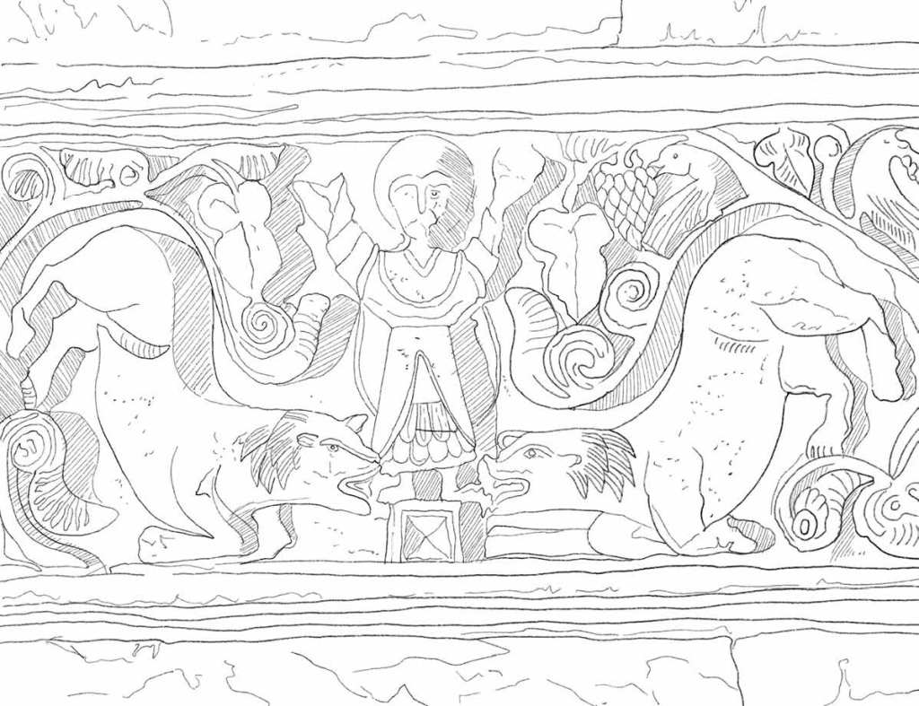 7th-century frieze on the west facade, south section; biblical scene of the prophet Daniel in the lions’ den