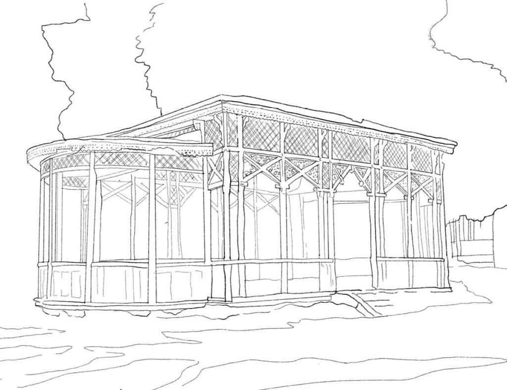late 19th-century gazebo; part of the Vardzia sanatorium complex; elongated plan with polygonal ends and carved wooden lattice