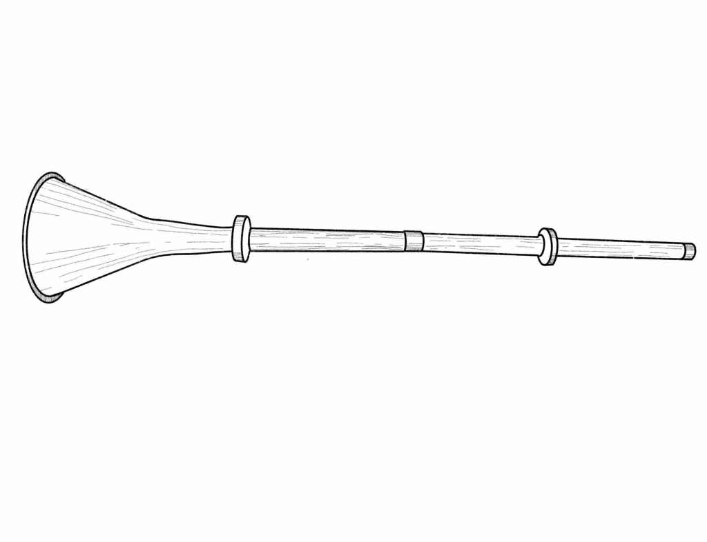 long natural trumpet; metal bell with wooden inner tube; military signaling and processions