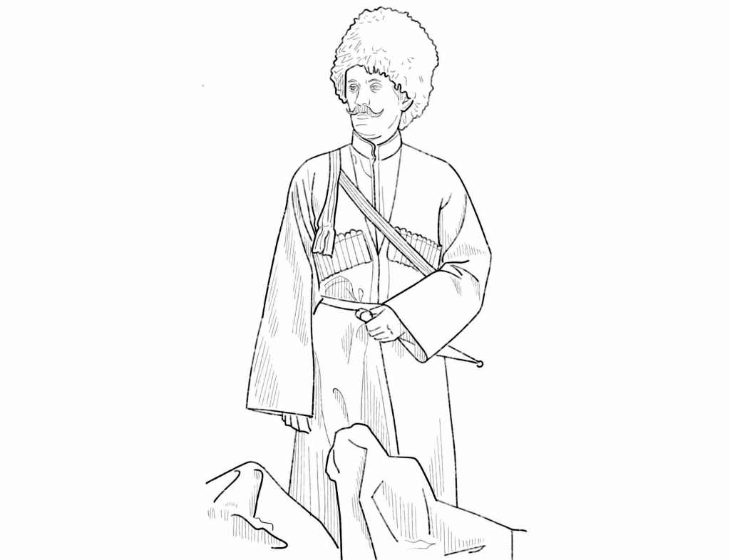 traditional Georgian male attire; woolen coat with chest cartridge tubes and sheepskin hat; rooted in highland dress, later adopted nationwide