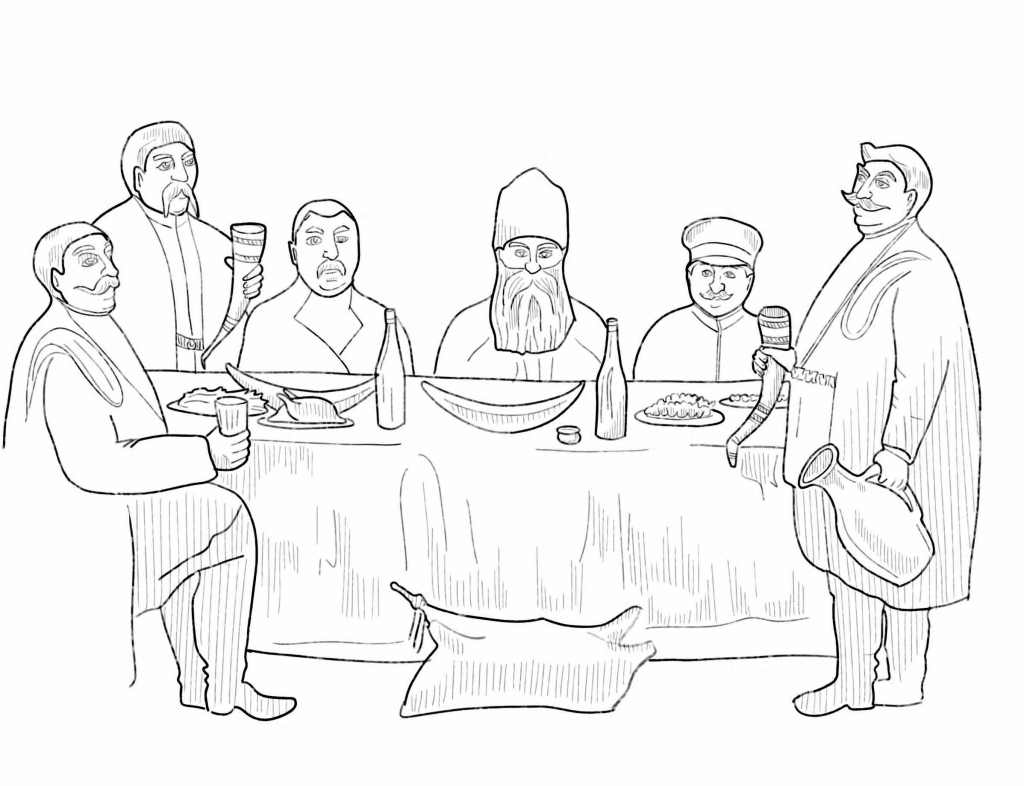 traditional Georgian feast with shared dishes, wine, rounds of toasts and blessings, often with polyphonic singing