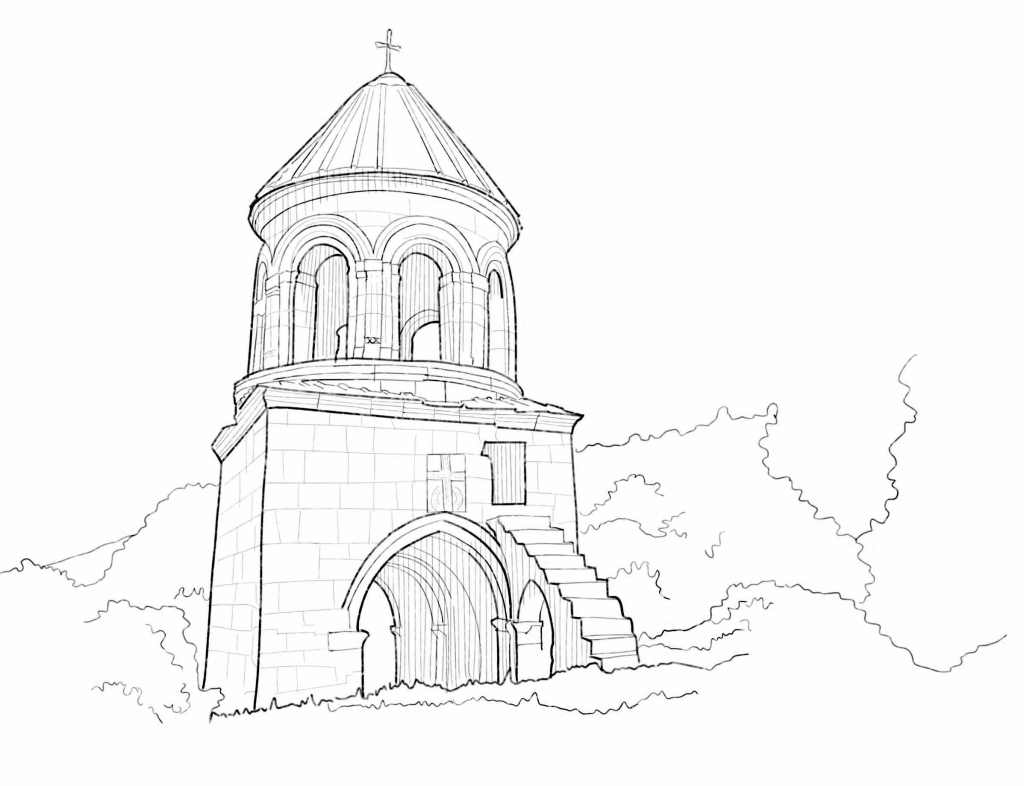 1278 two-story monastery bell tower in a near-checkerboard pattern of sandstone and wine-red tuff; oldest dated bell tower in Georgia