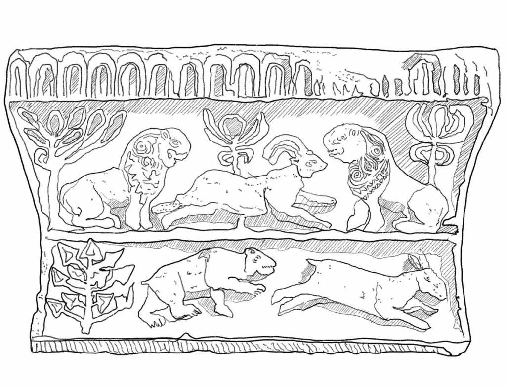 late 5th-century capital on the south pre-apse pilaster; lions and a bear chasing chamois