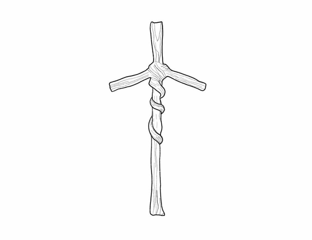 grapevine cross of St. Nino with branches bound with her hair and drooping arms; symbol of Georgia’s 4th-century Christianization