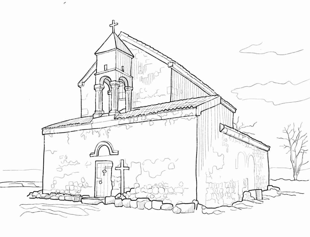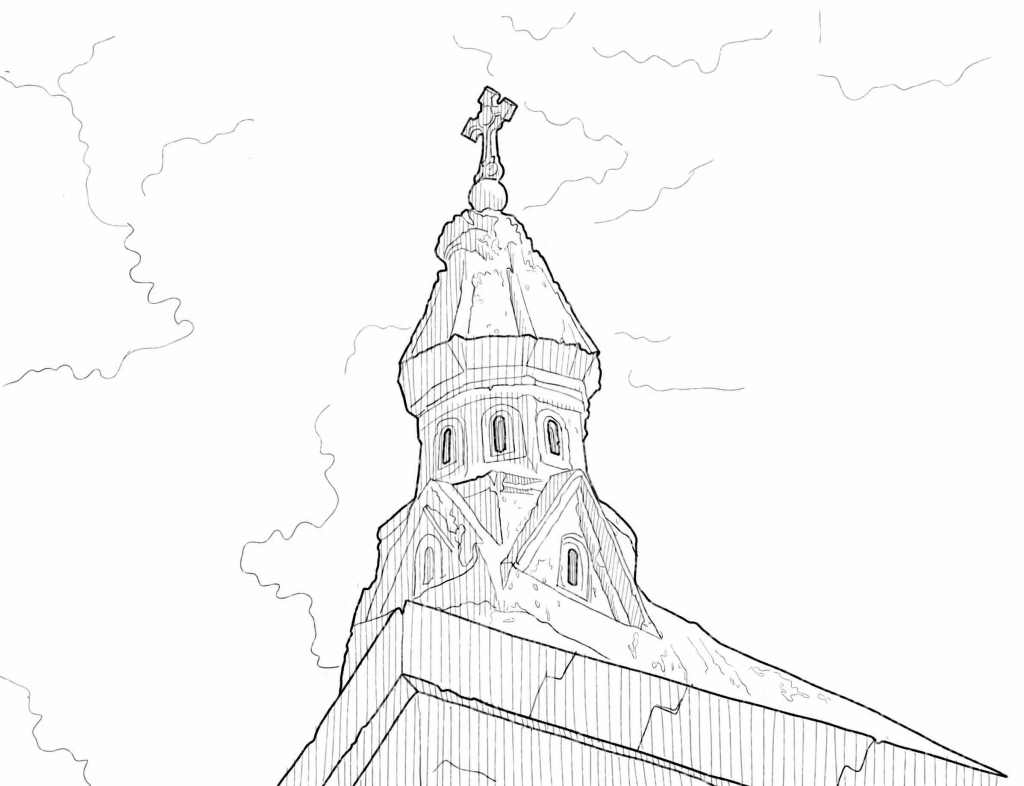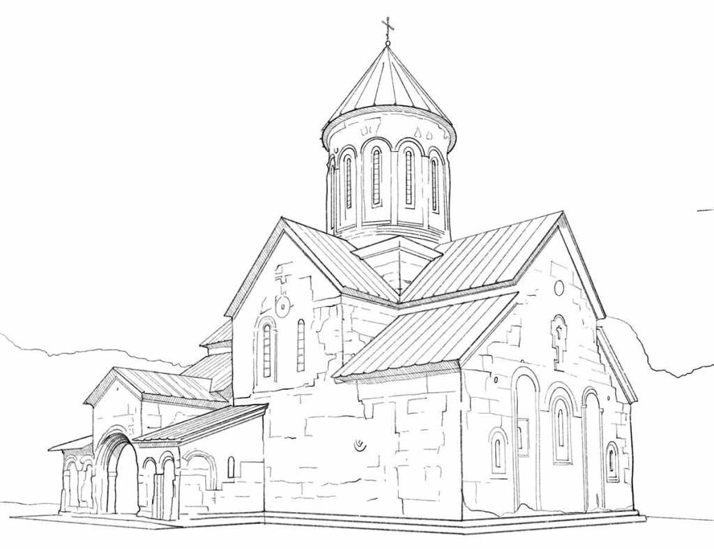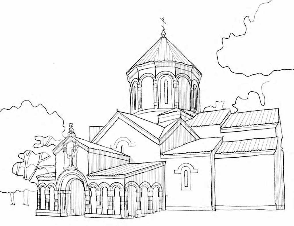one of six miniature church sculptures located at the corners of the roof of Svetitskhoveli Cathedral; positioned above the western entrance