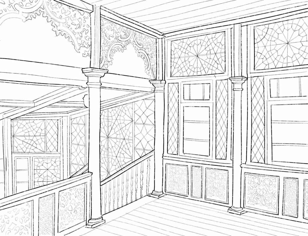 likely late 19th–early 20th century; angular glazed wooden gallery with Doric posts and lattice screens