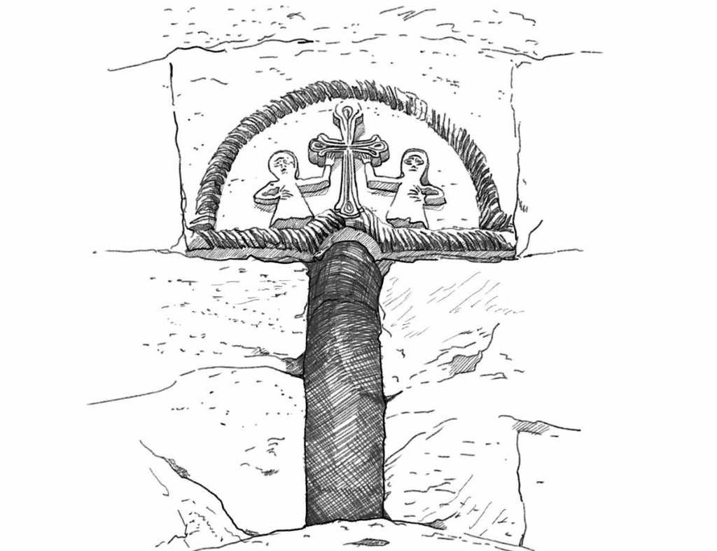 13th-century stone relief above the entrance to Mgvimevi Monastery; two figures flanking a cross within a rope-moulded frame