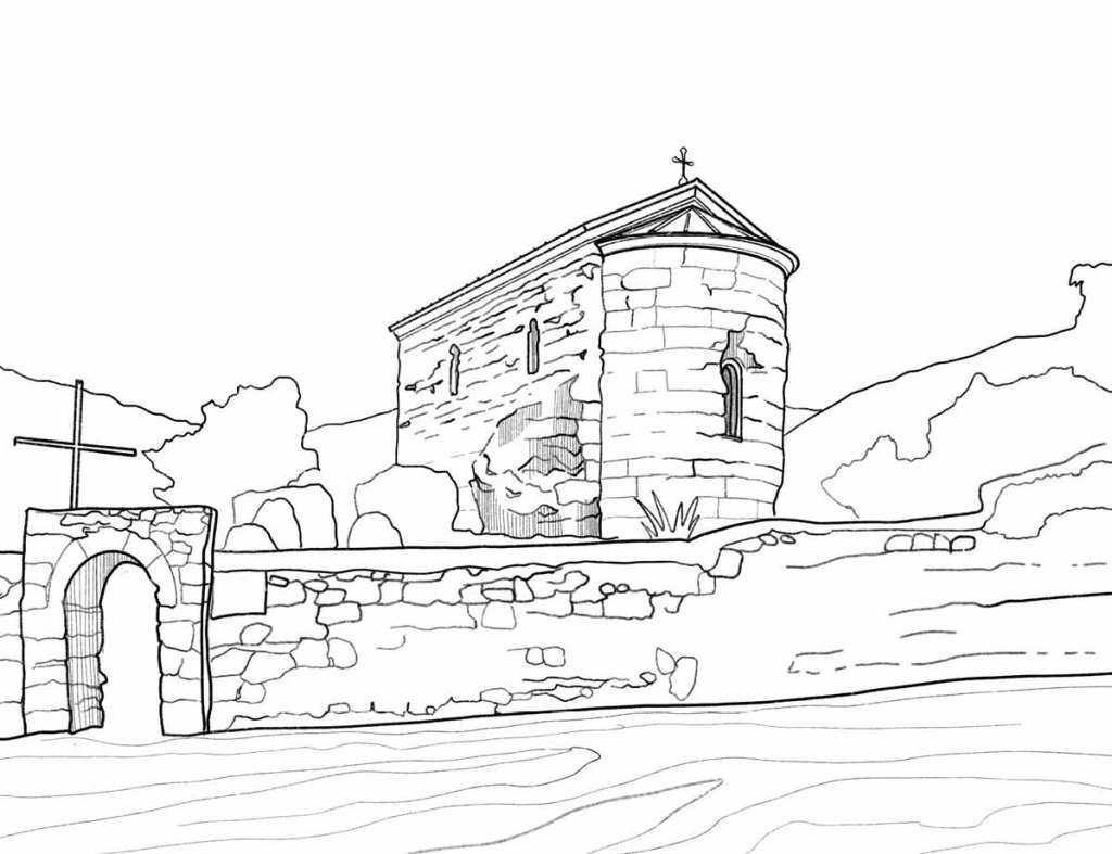 10th–11th-century hall church of Sts. Cyricus and Julitta; fresco cycle painted in 1112 by Tevdore; site of the major annual Kvirikoba festival