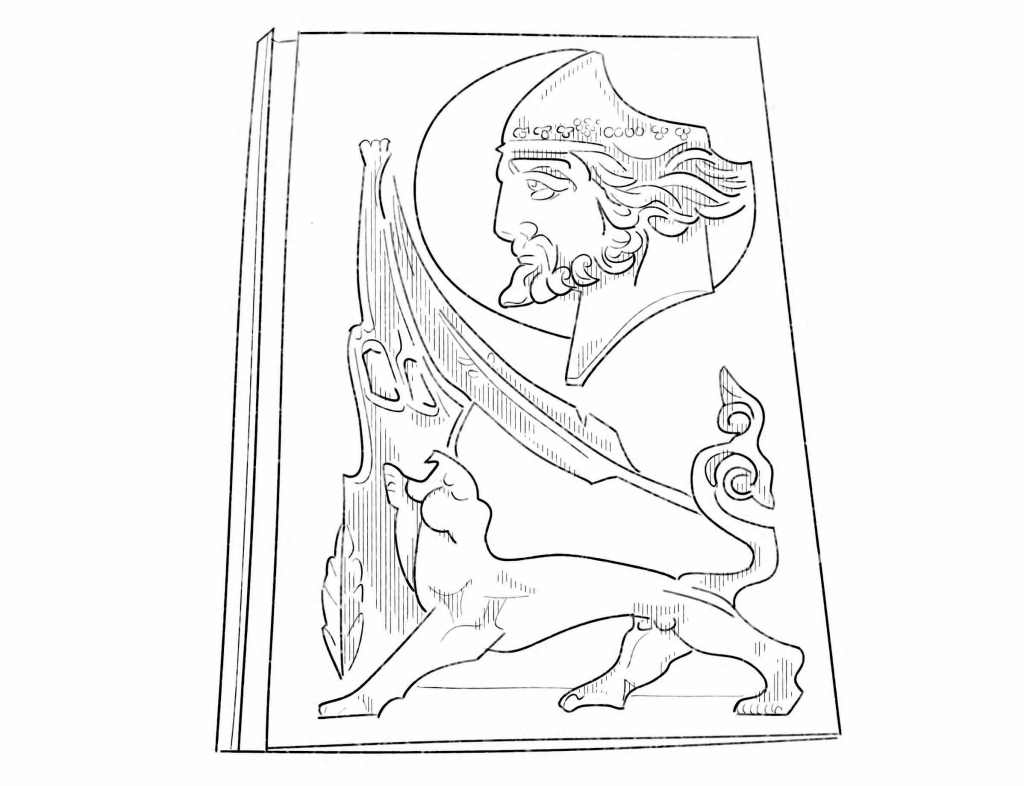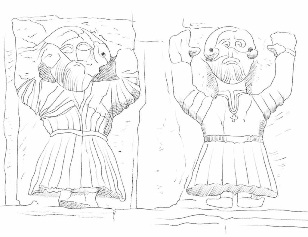 two male figures with arms raised in prayer; on opposite sides of the north façade window of the 11th-century Svetitskhoveli Cathedral