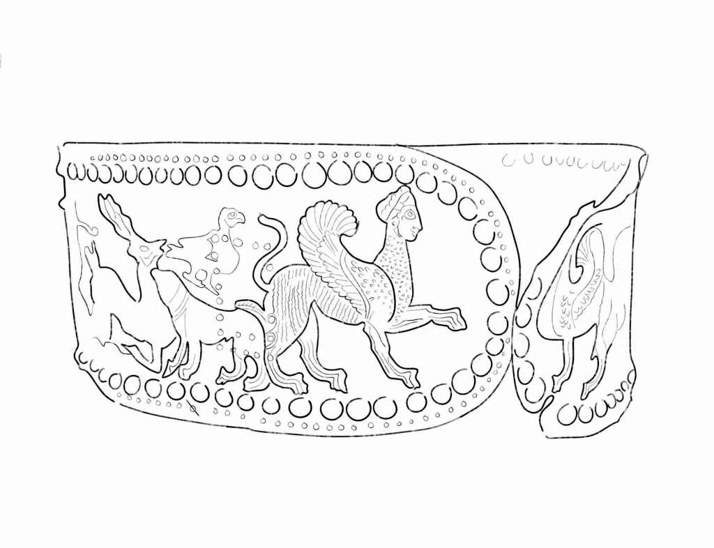 bronze belt from the end of the 4th century BC; Colchian tradition; frieze of banquet, hunting and animal row with sphinx terminals