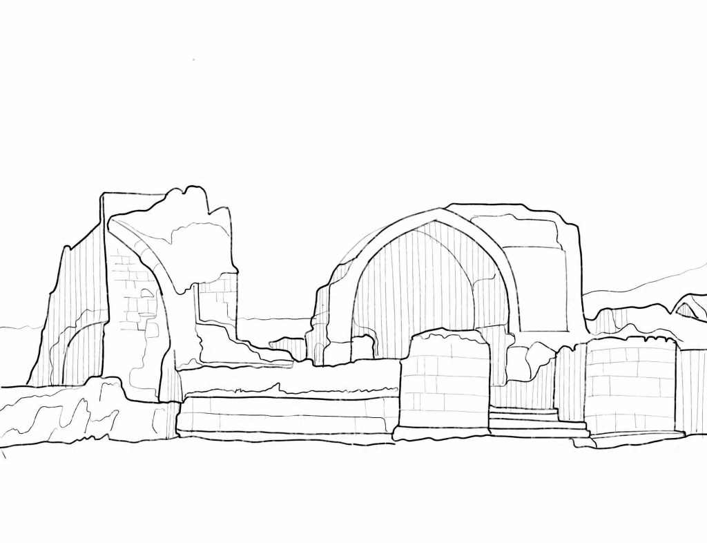 6th-century three-aisled basilica with surrounding gallery on three sides