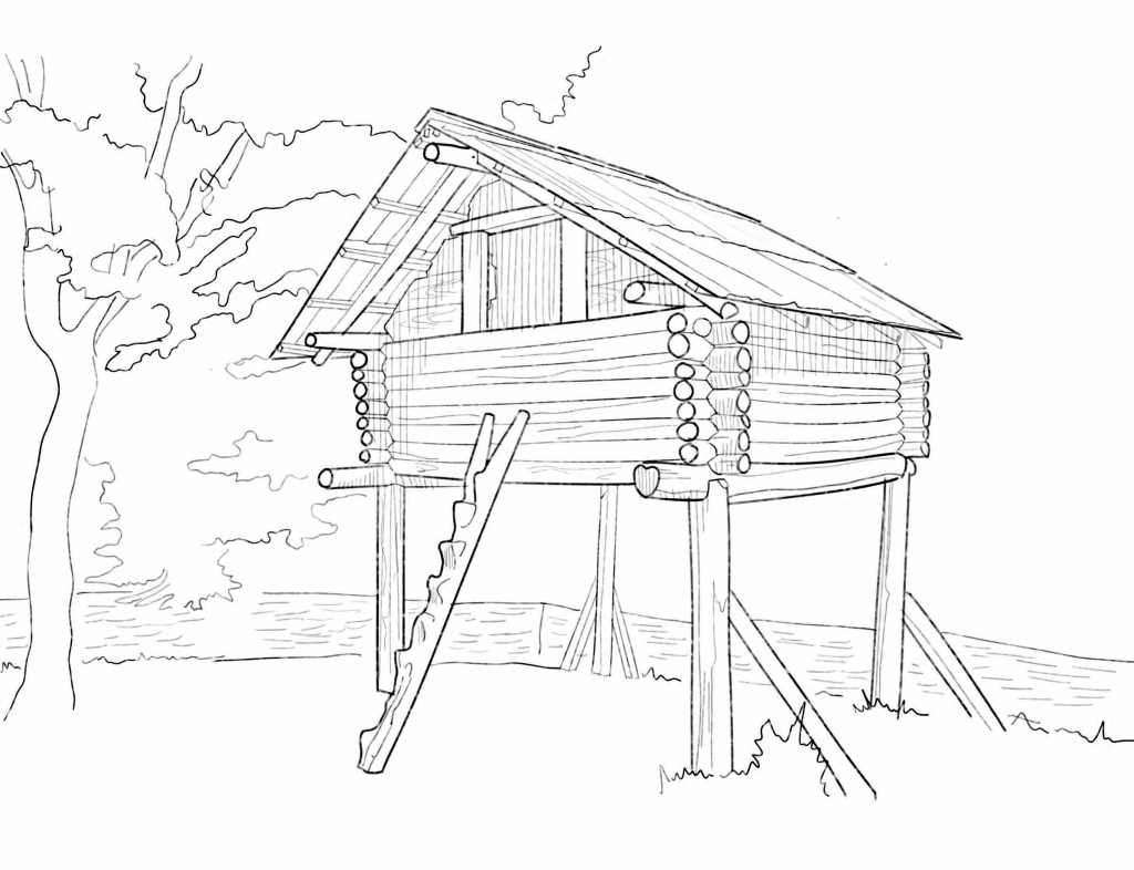 raised corn crib on high posts; sasiminde in Georgian; built in the 19th century; relocated from Jgali, Samegrelo
