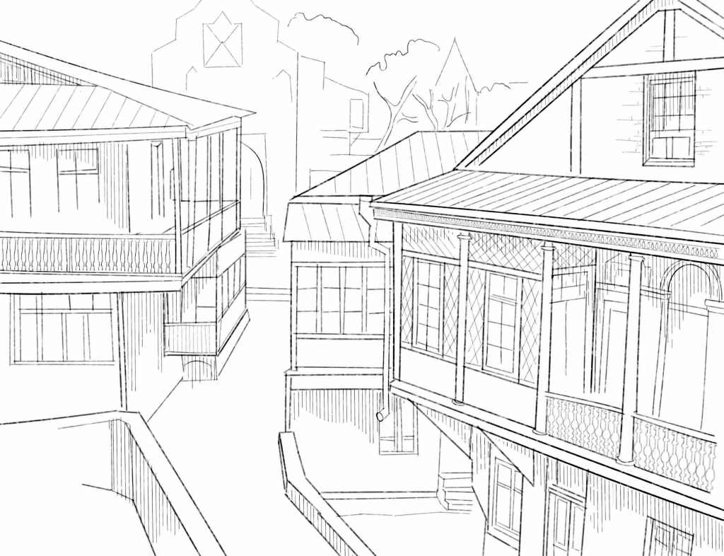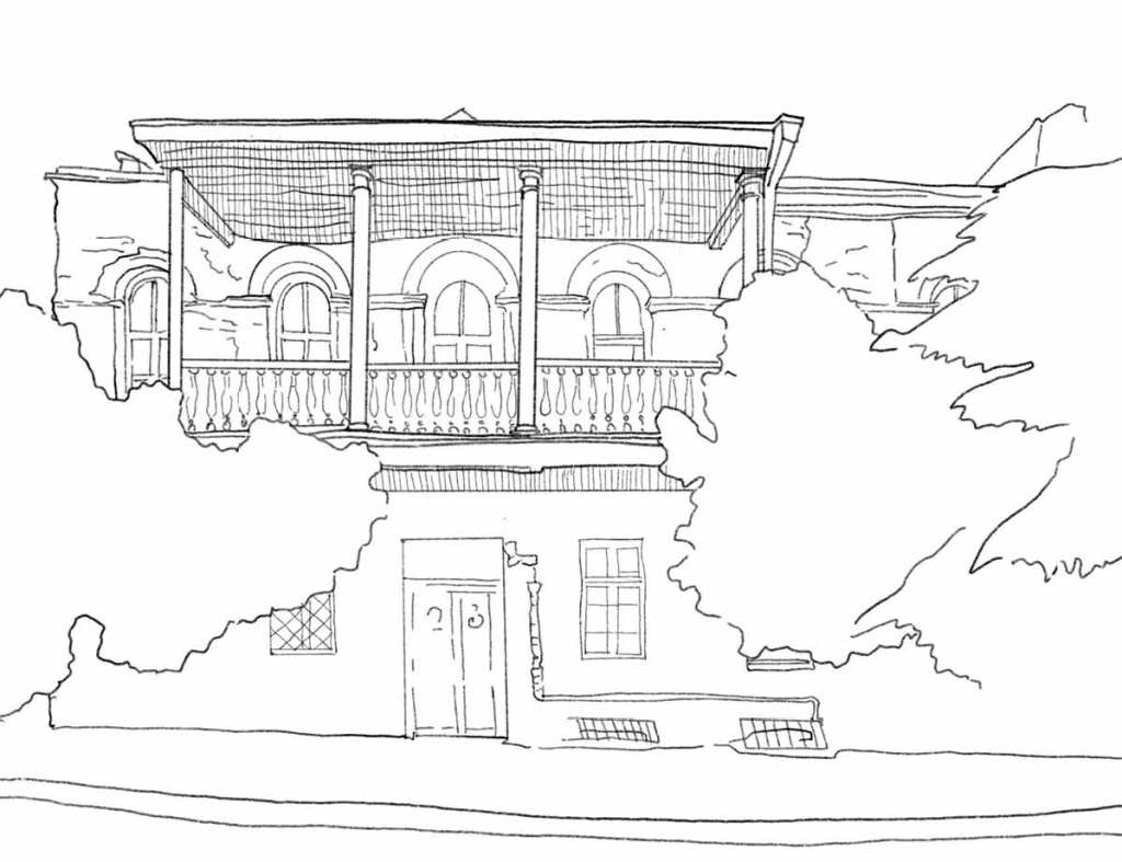 mid-19th-century house characteristic of Tbilisi’s early urban development; Europeanized street facade with carved glazed wooden balcony