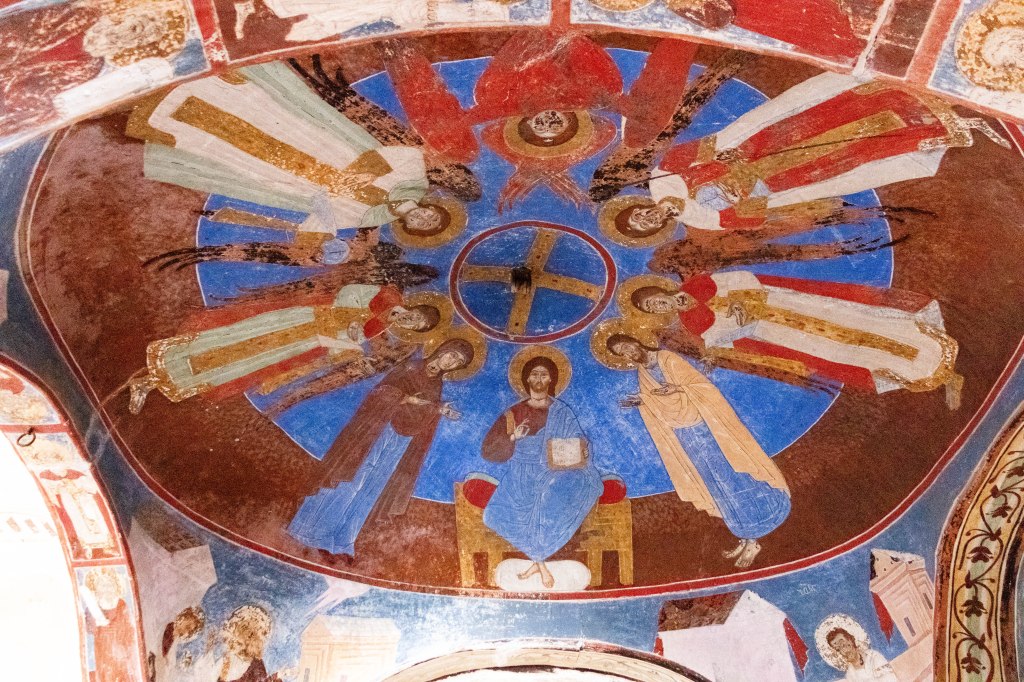 The interior of the church is especially noteworthy for its exceptional murals and mosaics. The mosaic of Virgin Nicopea, flanked by archangels and set against a golden background, was created between 1125 and 1130 and rivals the finest Byzantine works of its time. The frescoes of the same period are mostly preserved in the narthex, while the southeastern chapel and the southern porch have Palaeologan-style frescoes from the late 13th and 14th centuries.