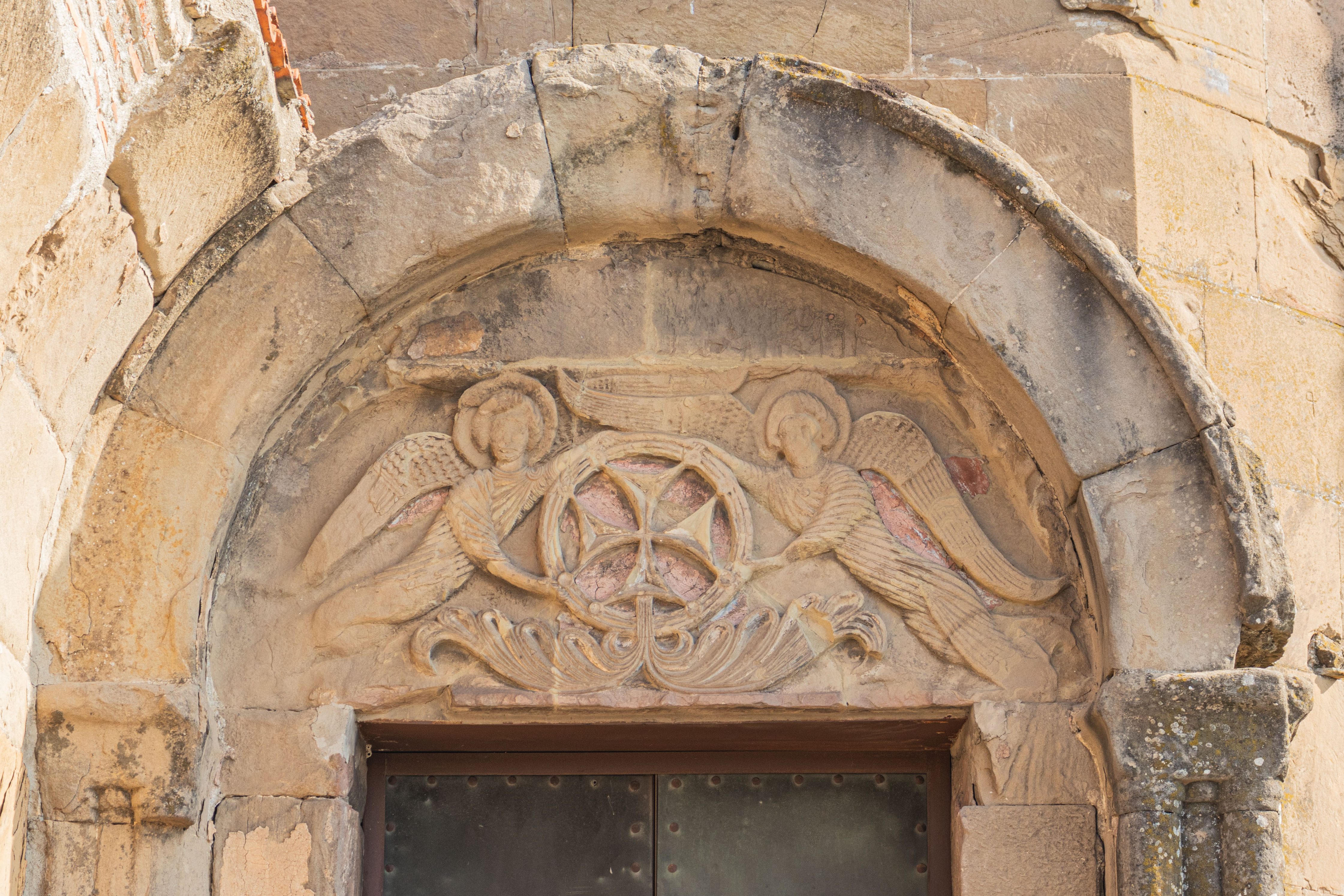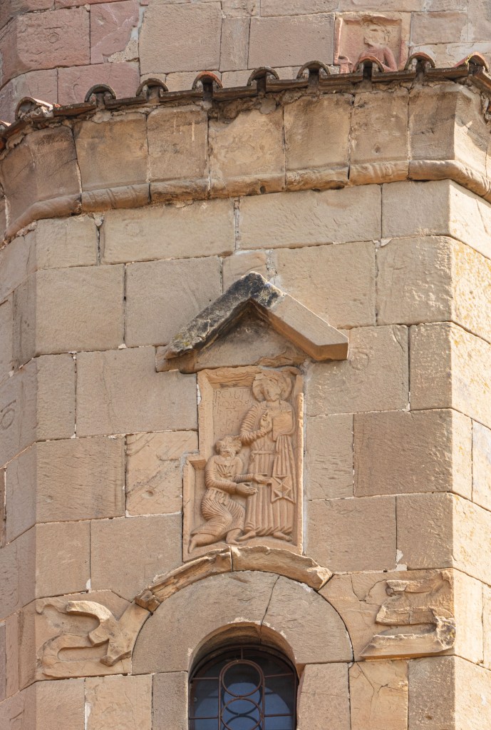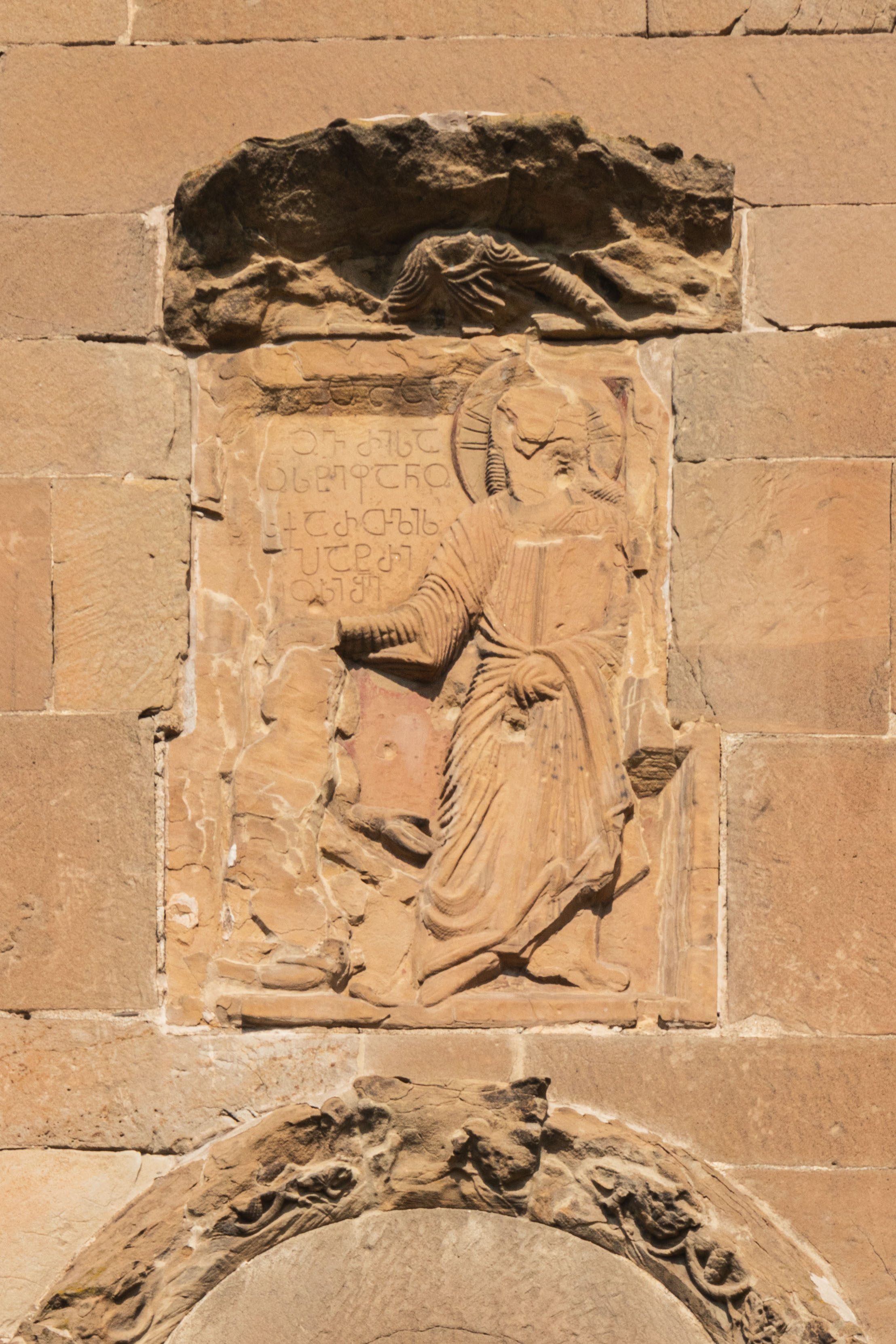 Below, just above the entrance, there is the relief of the Ascension of the Cross, where two angels hold the cross of the cross-pattée type (it is characterized by the specific shape of the arms: they are narrower in the middle and wider at the edges, like an animal’s pad; the earliest Georgian example of cross-pattée locates in Bolnisi Sioni basilica).
