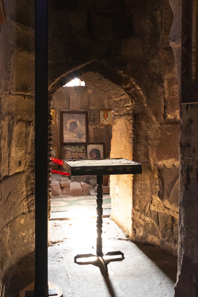 The basis of this church structure is the tetrachronch, i.e. a building with four apses (the word tetrachronch can actually be translated from the Greek as “four shells”). The peculiarity of the “Jvari-Hripsime” type, which is considered to be of Byzantine origin, is that there are four niches between the apses, a cruciform floor plan, but no supporting columns. Four cylindrical niches between the apses lead to the auxiliary rooms — pastophoria, i.e. rooms for church equipment, adjacent to the apses. The core of the Jvari central space is a wide central bay, but the whole building is slightly elongated due to two additional spaces in front of the eastern and western apses.