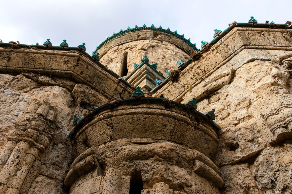 The church is made of locally quarried tuff stone shirimi and roofed with blue glazed tiles. From the outside, the apses are pentagonal. This pentagonality is defined in the corners of each apse facet by bundles of three semicolumns from which arches are thrown. All the interior parts project outwards, so that the structure of the church with its square central bay, four apses and four niches can be clearly seen, although some elements are too small due to the overall size of the church.