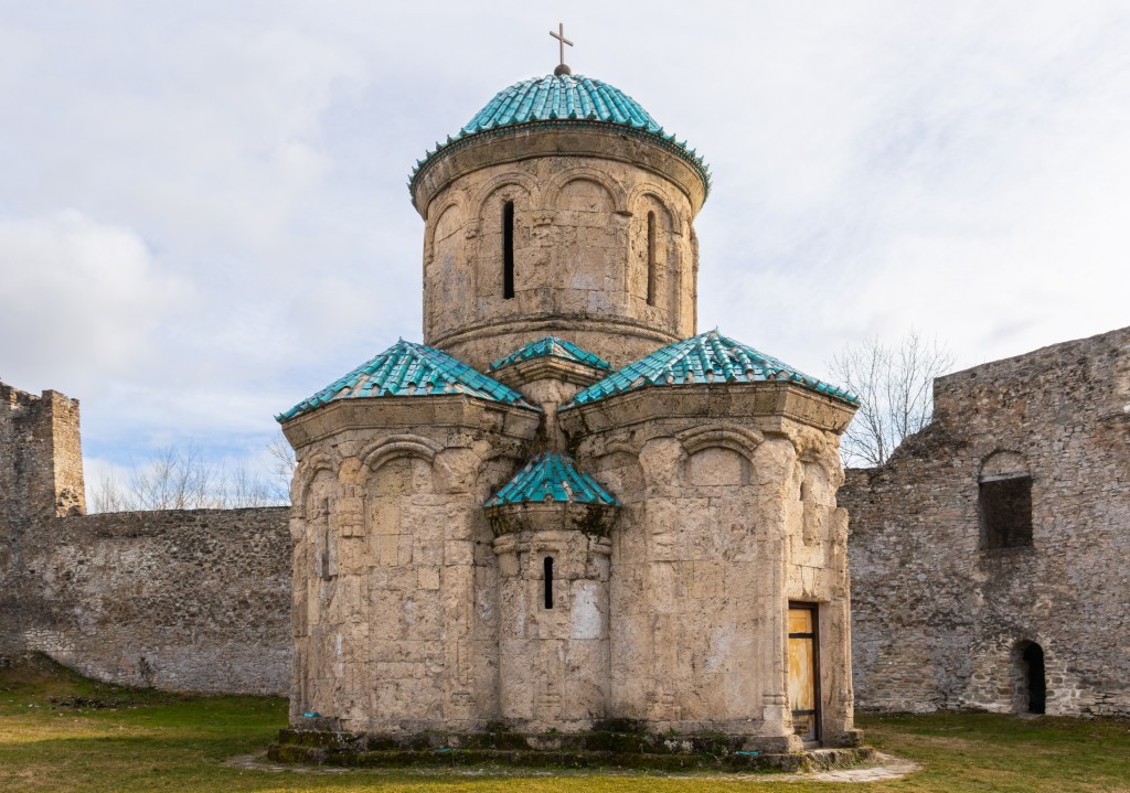 The exact date of the construction of the church of Kvetera is unknown, but it is more likely that it was built in the first half of the 10th century. It is characterized by its distinctive compact symmetrical structure. The church has a tetraconch design – a domed structure with four apses symmetrically arranged around the central space. However, in contrast to the famous Jvari tetraconch, there are no chambers between the main apses, only four three-quarter niches. It rather resembles the structure of a small domed church in the Dzveli Shuamta monastery. Despite its small size, the church has two entrances, one from the south and one from the west.