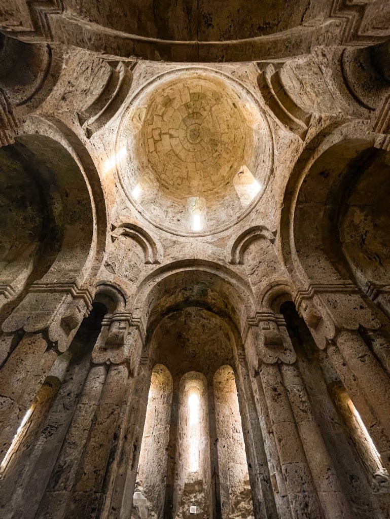 The church has no frescoes or carved reliefs. Instead, it has architectural decorations incorporated into the structural elements of the building. The central dome with 6 small windows is supported by pendentives that gracefully transition from the square base to the circular drum. The windows were designed to create a specific visual effect of light and shadow, being very small on the outside but much larger on the inside.