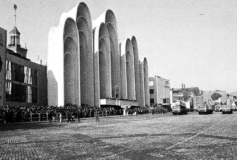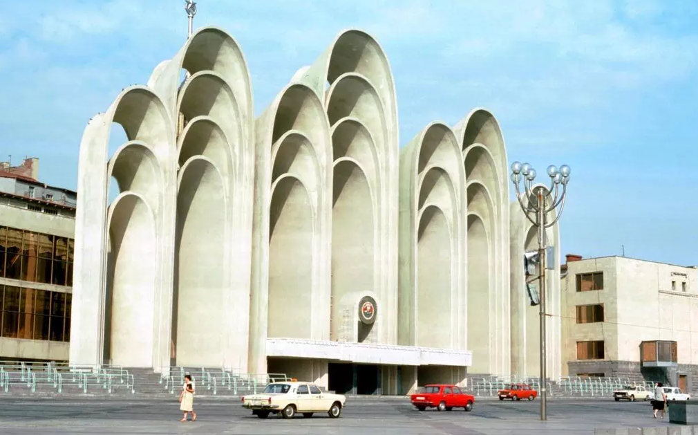 To make Republic Square suitable for public events such as parades and demonstrations, the unsightly rear facade of the Melik-Azaryants residential complex on the southwest side had to be concealed. The solution was a striking concrete structure: a series of seven arches with a podium. Officially named the “Spatial Arcade of the Tribune of the Celebration Square,” it was nicknamed “Andropov’s Ears” by locals, a reference to USSR leader Yuri Andropov, due to the distinctive shape of the arches.