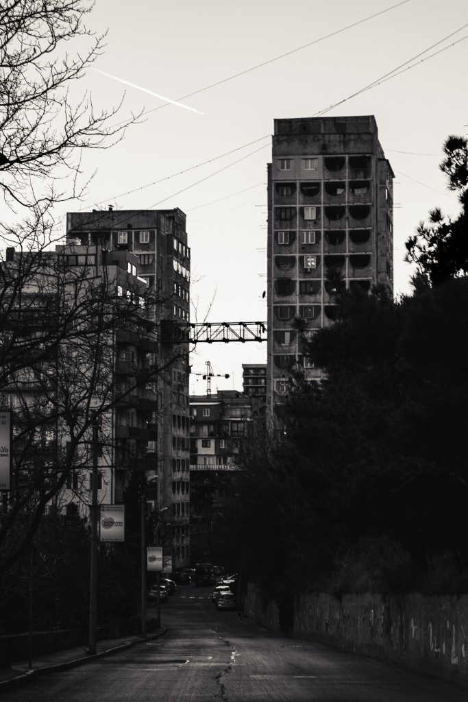 In the mid-1970s, alongside the general development and reconstruction plans for Georgian cities, urban planners began designing unique residential areas, especially on challenging terrains. One of the most remarkable examples of this was the construction on the steep slopes of Nutsubidze Street. Architects Otar Kalandarishvili and Gizo Potskhishvili, known for their innovative approach to Tbilisi’s complex topography, designed a striking residential complex consisting of three prefabricated buildings, ascending in height along the slope of the Nutsubidze Plateau. The 14-story lower building serves as a hub, equipped with elevators, and connects to two 15-story structures above via elevated walkways supported by metal arms. A light serpentine road allows car access between the buildings.