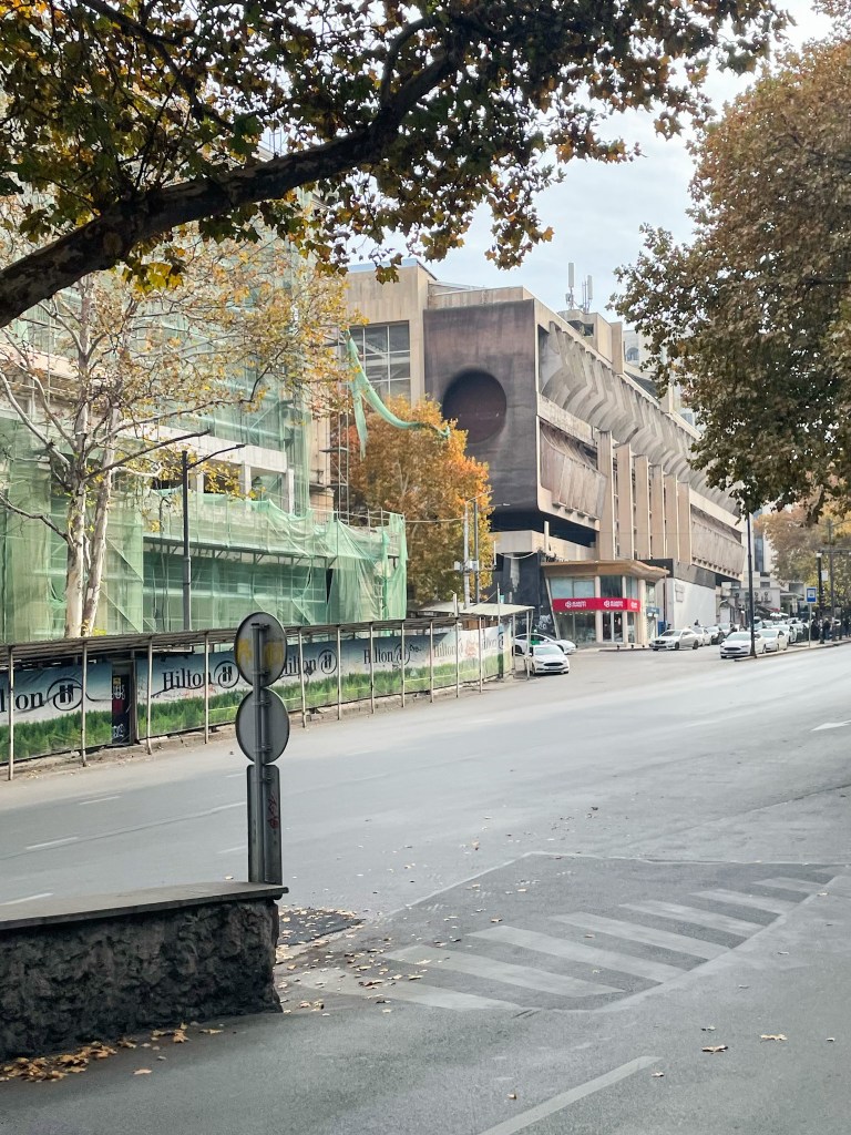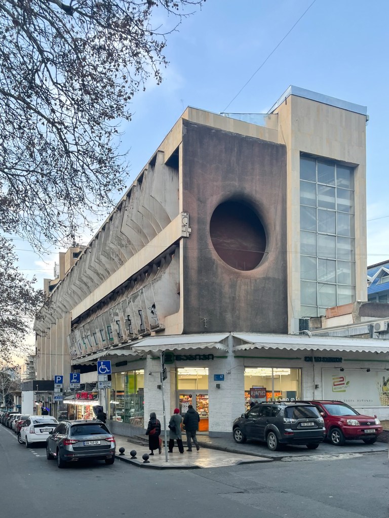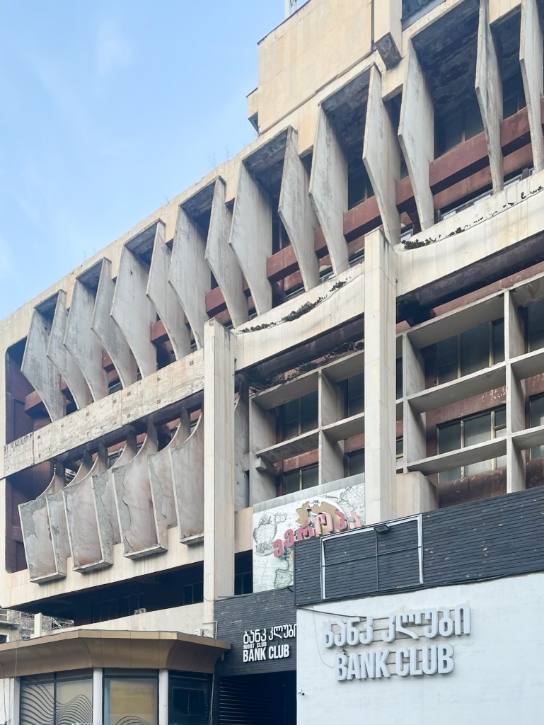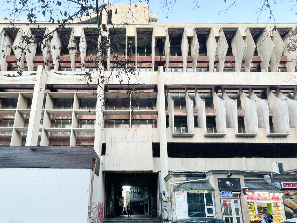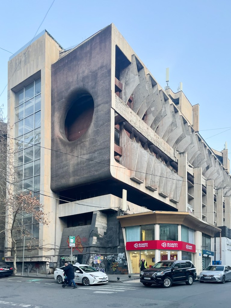 The building of the Scientific-Technical Library is a prominent example of Soviet modernist architecture. It is located along Merab Kostava Street, between Vere Park and Hero Square. Despite its utilitarian purpose, the building’s design incorporates distinctive elements that blur the line between function and decoration. The most striking feature of the façade is the series of vertical concrete structures resembling sunshades, designed to protect the interior spaces from the sunlight, which is particularly relevant for Tbilisi as a city where bright sunlight is a constant factor in ensuring a comfortable environment inside the library halls. However, despite their practical role, the sunshades become an aesthetic focal point, contributing to the unique visual appeal of the building.