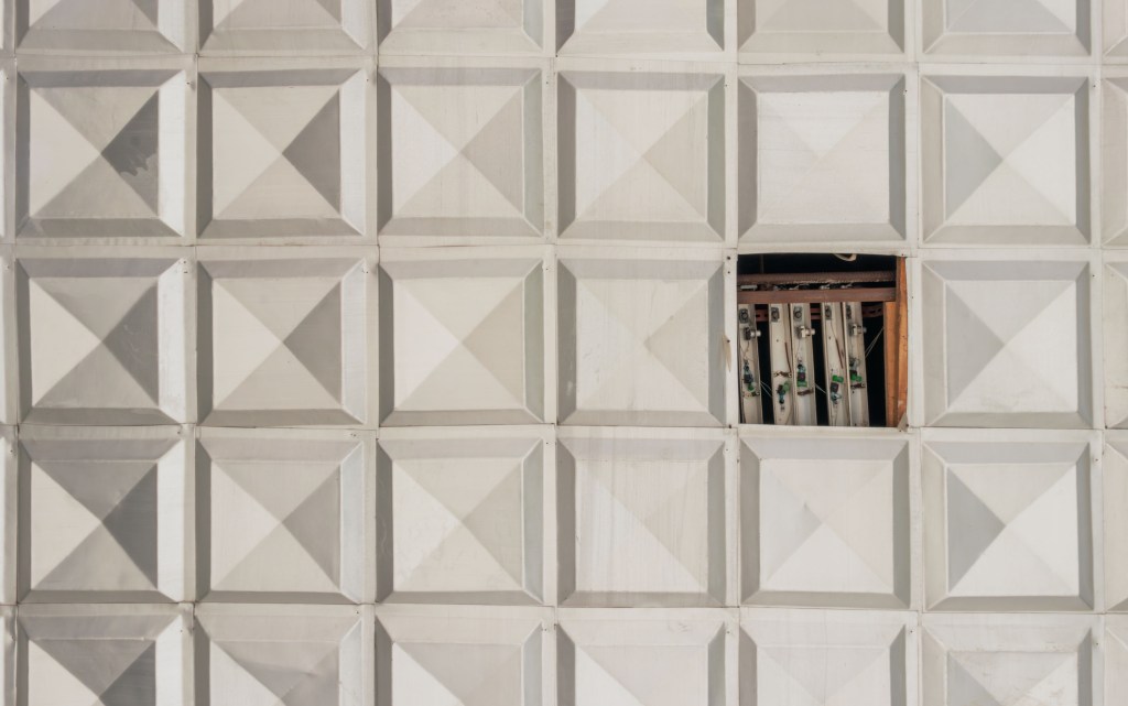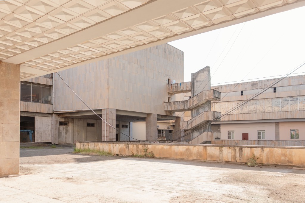One of the major completed elements of the campus is the scientific library, designed to house five million books. Envisioned as the geometric and compositional center of the complex, this library features a striking modernist design. At its core lies a cubic form that serves as the main structural element around which the building is organized. This cube is enhanced by covered galleries on the second floor and open galleries supported by pillars on the first floor, creating a harmonious balance between enclosed and open spaces. Notably, there is an asymmetry between the cube and the lower structures, as the cube is shifted toward the right side of the gallery layer. Despite this shift, the relationship between the two parts remains predominantly harmonious. The façades of the upper cube are adorned with concrete panels and metal ornamental inserts, adding a subtle layer of geometric detail and Georgian decorative motifs to the clean modernist forms.