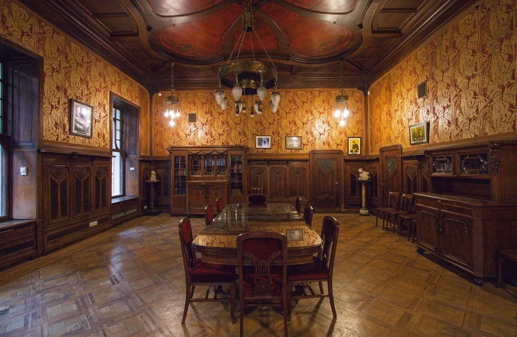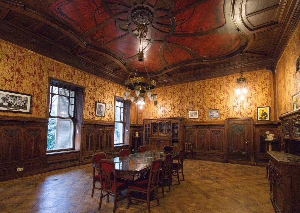 What sets the house apart is the survival and completeness of its interior décor. Mamatsashvili’s carpentry binds rooms into a sequence – doors in deep relief, stair balustrades, panelled walls and ceilings. The principal salon – the drawing in the coloring book – is calibrated for reception: the joinery’s flowing wall and ceiling profiles carry Art Nouveau’s wavy lines and interplay with dark wooden furniture and wall ornament.