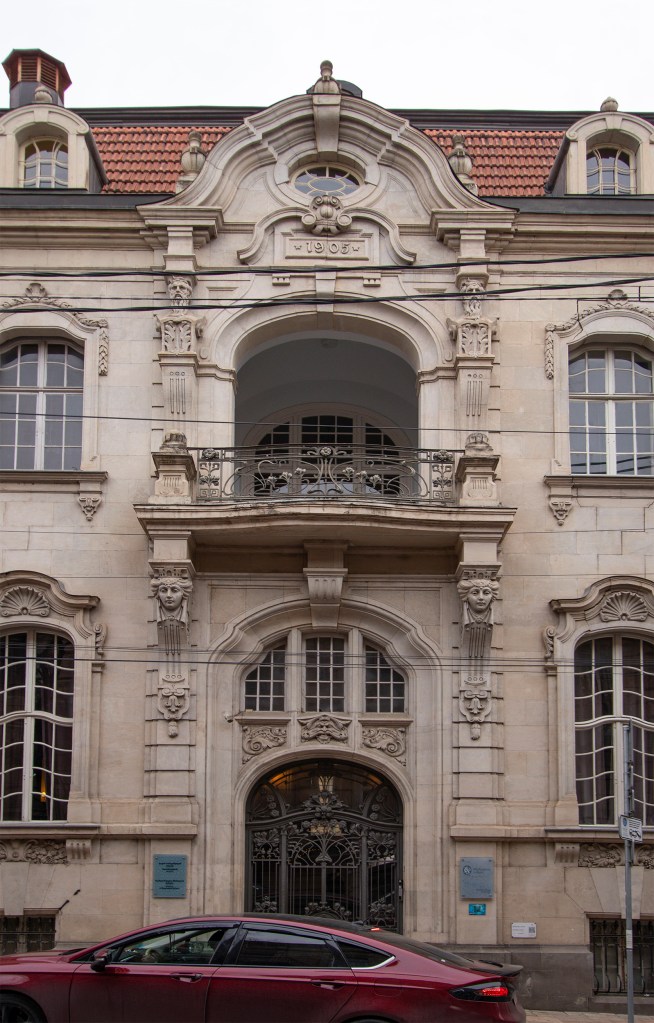 Zaar’s elevation speaks a measured Art Nouveau with neo-Baroque inflection – wavy cornice lines, fine ironwork, plastic stucco – laid over an artificial-stone facing and capped by a tall mansard.