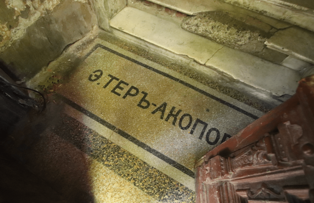 The entrance ensemble survives and is readable in everyday use. At the threshold, Ter-Akopova’s name is set in inlaid terrazzo, i.e. a cast-in-situ cement matrix with fine marble chips, bordered by contrasting bands; the black letters are a darker terrazzo mix poured into letter molds and then ground and polished flush.