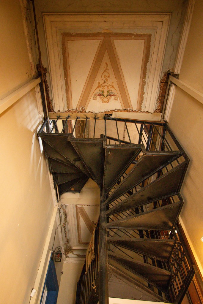 There is also a gold-lettered signature of the Italian craftsman Angelo Andreoletti ties the stair and marble/terrazzo finishes to his workshop. Stair finishes, painted wall and ceiling panels, crisp door carpentry, and cast-iron elements (including a lamp stand at the portal) continue the decorative program. Several present-day venues in the building allow a courteous glimpse of these interiors.