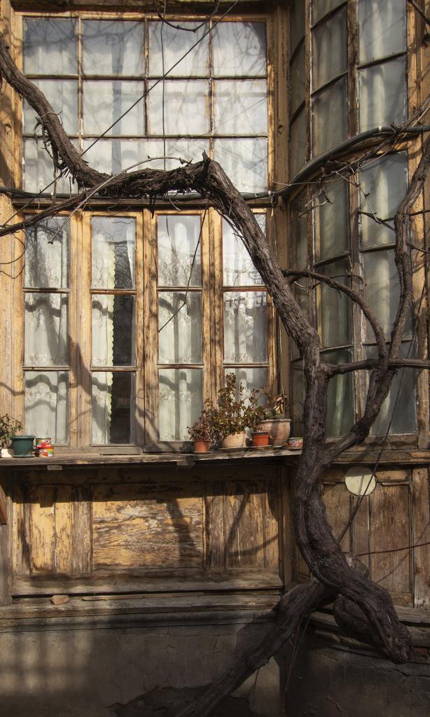 What you see in the coloring-book illustration is the courtyard elevation of the twin houses and a lower corner house that links the two main volumes. The prominent elements are loggias, or enclosed glass balconies. In Georgian they are called shushabandi (შუშაბანდი): the word fuses shusha “glass” (from Persian šīše) with the element -bandi“enclosure/fastening,” a productive Persian suffix also familiar from terms like yazdi-bandi. Shushabandi create a luminous threshold between inside and out – distinct from Tbilisi’s open wooden balconies yet fully part of the city’s communal courtyard life. It is no exaggeration to say the Jagetian shushabandi are special: their gently wavelike plan is unusual for Tbilisi and shape a uniquely charming courtyard.