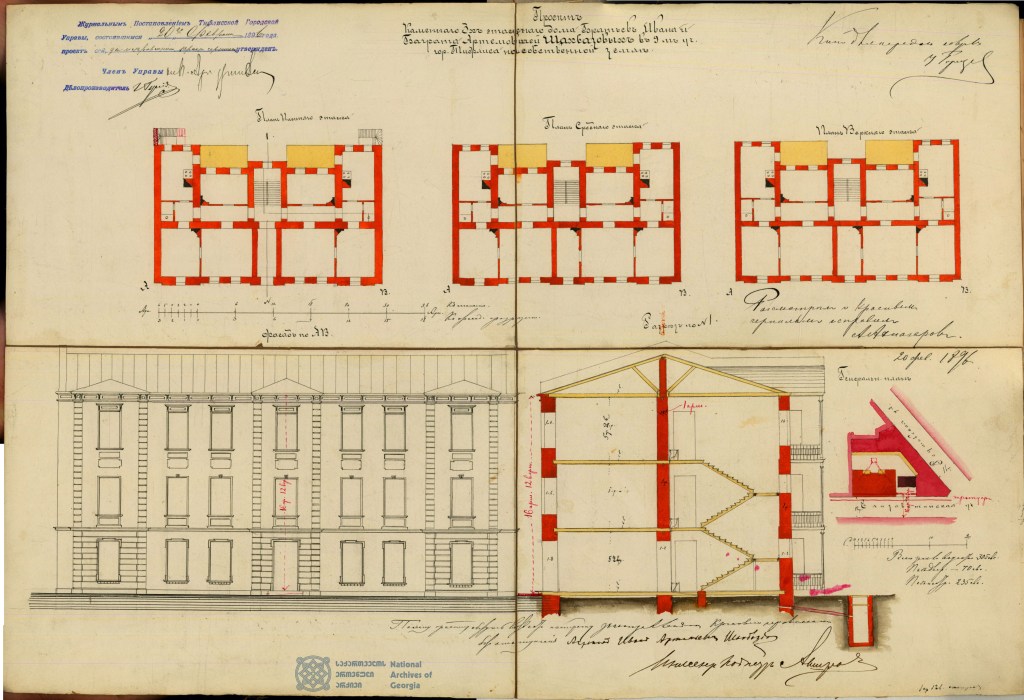 The surviving set from the historical archive includes a site plan, three floor plans, a street elevation, and a longitudinal section; the author’s signature is hard to read. The drawn scheme is symmetrical – central entrance and stair, one apartment on either side per floor, continuous timber balconies to the courtyard on all three storeys. In reality, the built ensemble diverges, and not only in the absence of the central axial stairs. In the courtyard elevation, the galleries/balconies are shown open rather than glazed – glazing likely occurred after completion. More discernible are differences on the street façade: it is clear that the central bay was planned to project like the shallow side bays, but this was not realised. As for rustication, it was planned only on the projecting parts of the ground floor, but was executed across the entire ground-floor façade. However, such deviations were common in Tbilisi residential architecture when one compares designs approved by the Tiflis City Administration with the houses as built.