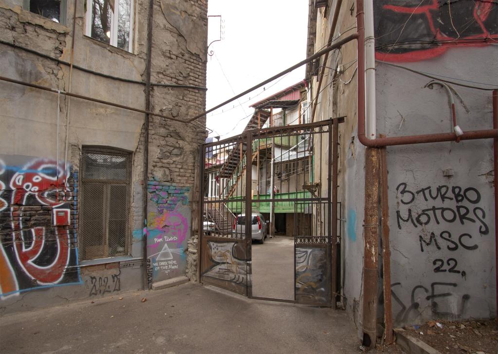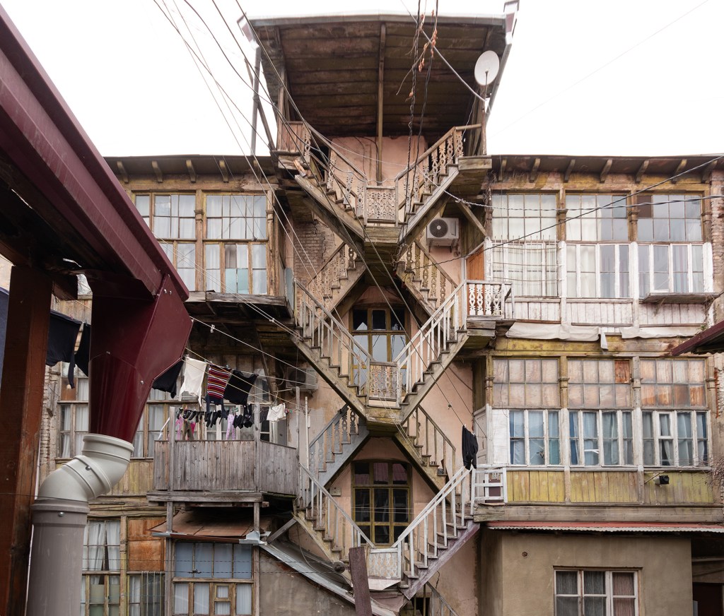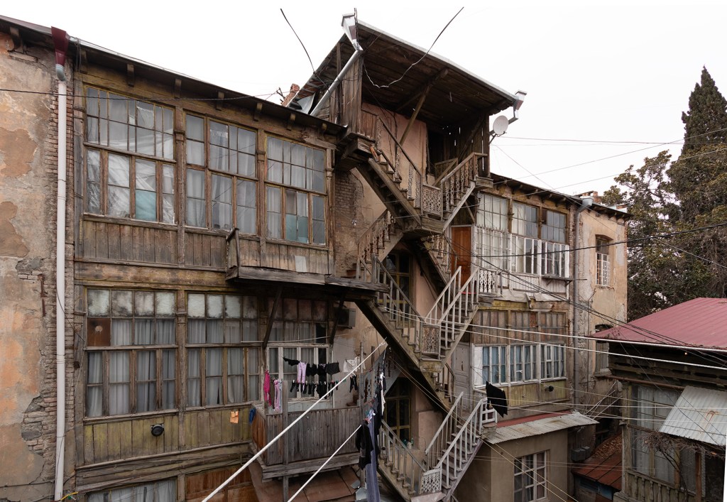 Seen within the broader evolution of Tbilisi housing, No. 49 condenses a familiar duality: a Europeanised public face to the street and social-domestic life organized around timber galleries and open circulation in the yard. This “inner side,” unlike the “front side,” was less governed by official taste and more open to local craftsmanship, which often took the form of open or later glazed balcony-galleries. From the 1830s onward, such galleries became a defining social space of Tbilisi’s residential architecture; here, however, the rare axial stair intensifies that effect, turning the interior court into a small landmark in its own right. Even today the building carries traces of its long life in the weathered masonry: a vertical crack, reported by residents as an after-effect of the 1988 Spitak earthquake, runs down a plastered wall in the yard. Unfortunately, the overall condition of the house remains poor and unrestored despite its protected status (the building is registered as an immovable cultural heritage monument of Georgia, no. 5267).
