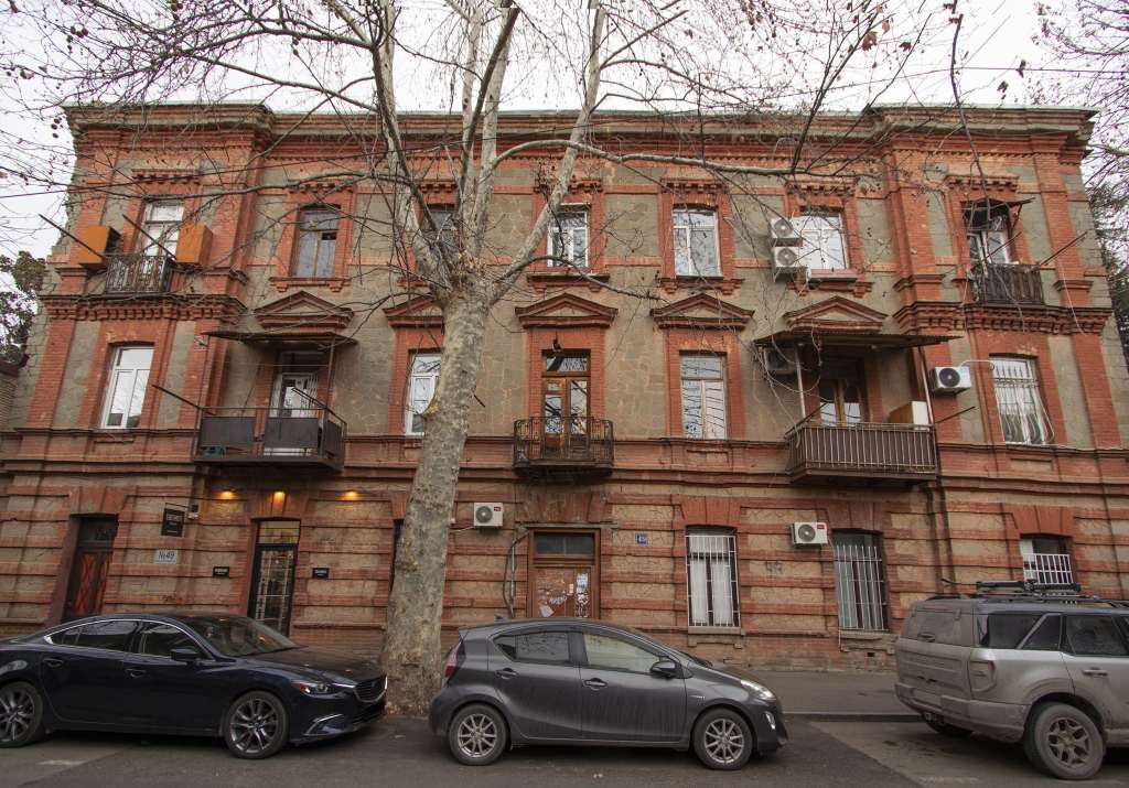 Characteristic, too, is the façade’s polychromy – alternating bright red brick with grey plaster imitating flat stone – which sharpens the relief of projecting elements. Because the neighboring house at No. 51 is only one storey high and the corner opens into a small square, the east side elevation is unusually exposed in the streetscape. Inside the entrance hall, the main stair alternates timber with cast-iron balustrade panels of scrolling volutes, a late-imperial motif encountered across Tbilisi.